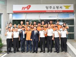강수현 양주시장이 26일 오전 추석 연휴를 앞두고 양주소방서를 방문해 직원을 격려했다. 이날 방문은 추석을 맞아 시민을 위해 노력하는 소방대원들을 격려하고 현안 사항을 전달하기 위해 마련했다. 이날