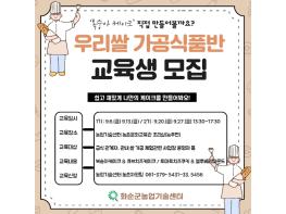 화순군은 우리 쌀 소비 촉진을 주도할 수 있는 급식 관계자 및 쌀 가공·체험 사업장에 우리 쌀의 우수성을 알리고, 쌀소비 저변확대를 위해 오는 21일부터 우리 쌀 가공식품반 교육생을 모집한다고 밝혔다.