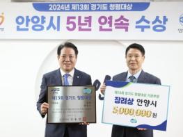 안양시가 ‘2024년 제13회 경기도 청렴대상’에서 장려상을 수상했다고 19일 밝혔다.시는 지난 2020년 장려상 수상을 시작으로 2021~2023년 우수상에 이어 올해까지 5년 연속으로 경기도 청렴대상에서 상을