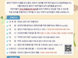 광진구가 오는 27일, 구청 구내식당에서 만 2~5세 유아를 대상으로 ‘어린이 김치 만들기 체험교실’을 운영한다.지난해 광진구 어린이 식생활을 조사한 결과, 응답자의 43%가 ‘김치를 거의 먹지 않는다’