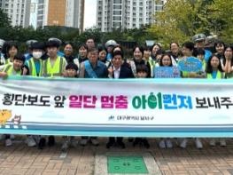 대구 달서구가 3일 아침 월암초등학교 학생 및 교사, 달서녹색어머니회, 달서경찰서와 함께 월암초등학교 앞 횡단보도에서‘아이먼저’어린이 교통 안전 캠페인을 실시했다. 달서구는 이날 월암초등학교 학