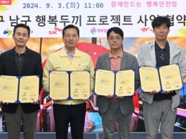 대구 남구는 3일 SK매직, 행복나래주식회사(행복얼라이언스 사무국), 행복도시락 사회적협동조합과 함께 『대구 남구 행복두끼 프로젝트』 사업 업무협약(MOU)을 체결했다고 밝혔다. 남구청에서 진행된 '