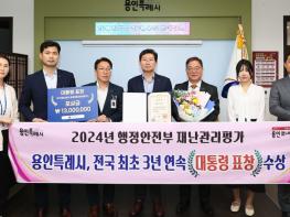 용인특례시는 11일 행정안전부에서 주관하는 '2024 재난관리평가 우수기관 시상식‘에서 대통령 표창을 수상하고 특별교부세 2억 4500만원을 지원 받았다고 13일 밝혔다. 행정안전부 주최로 열린 이날 시상