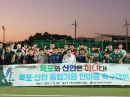 목포신안통합추진위원회 청년분과위원회는 지난 29일 신안군 청년들과 목포국제축구센터(인조구장A)에서 친선 축구대회를 가졌다.이날 축구대회는 목포?신안 통합을 기원하고 양시군 지역민의 우호를 다지기