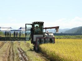 조길형 충주시장은 30일, 올봄 첫 모내기를 시연했던 주덕읍 화곡리 서강석 농가를 다시 방문해 올해 첫 벼를 수확했다.조 시장은 “올 봄에 이앙기를 운전해 모내기 시연을 했는데, 같은 논에 다시 방문해