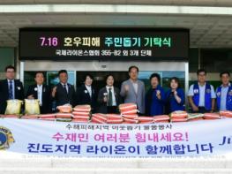 국제 라이온스협회 355-B2(전남서부) 지구와 진도지역 3개 라이온스클럽은 지난 28일에, 7월 16일 집중호우 피해로 어려움을 겪고 있는 수재민에게 전해달라며 진도군에 400만원 상당의 백미(10kg) 140포를