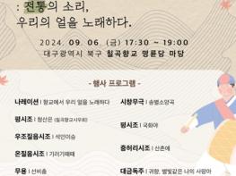 대구 북구청은 오는 9월 6일, 칠곡향교 명륜당 마당에서 ‘시조창 발표회’를 개최한다.천고마비의 계절, 가을을 맞아‘느림과 울림 : 전통의 소리, 우리의 얼을 노래하다’라는 이름으로 9월 6일 오후 5시