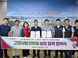 울산 중구와 혁신도시 공공기관 노동조합 협의회가 8월 26일 오후 3시 중구청 구청장실에서 고향사랑기부제 활성화를 위한 ‘고향사랑기부제 상호 협력 협약’을 체결했다.이번 협약식에는 김영길 중구청장