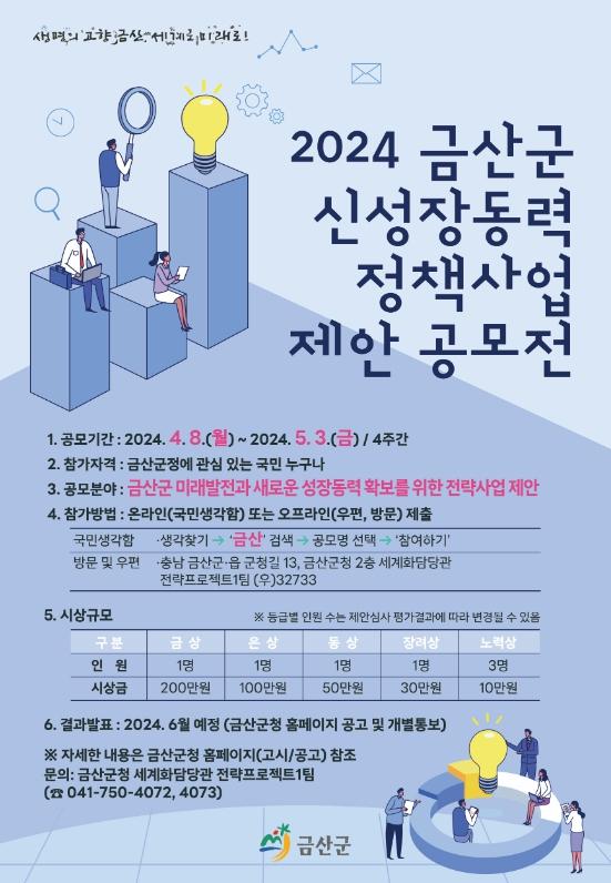 금산군은 지역의 성장잠재력 저하에 따른 위기를 극복하고 새로운 활력을 얻기 위해 5월 3일까지 2024 신성장동력 정책사업 제안 공모전을 개최한다.