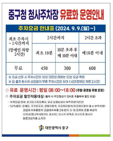 대전 중구는 청사 방문 목적 이외의 장기 주차 등으로 주차 공간이 부족하여 발생하는 민원을 해소하고 민원인들의 주차 편의를 제공하고자 구청사 부설주차장 요금을 인상한다고 밝혔다.