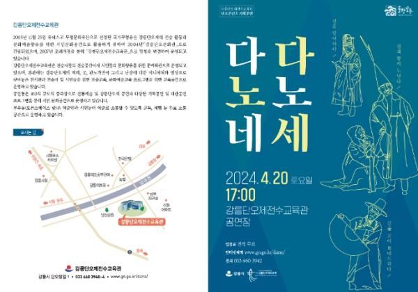 강릉단오제전수교육관은 강릉단오제의 전승발전과 공연예술 활성화를 위해 단오콘텐츠기획공연'다노네, 다노세'를 오는 4월 20일 오후 5시 공연한다.