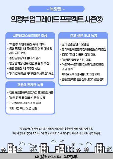 의정부시는 시민들의 삶의 환경을 한 단계 개선하기 위한 ‘의정부 업그레이드 프로젝트’의 시즌2 녹양편을 30일 발표했다.