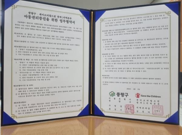중랑구가 이달 2일 세이브더칠드런 중부1지역본부와 아동 권리 증진을 위한 업무협약을 체결했다.