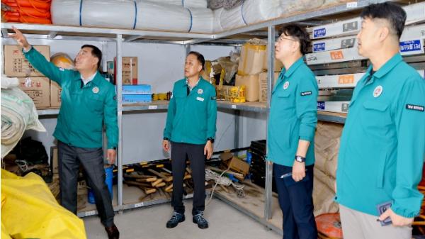 김윤철 군수는 수방자재 창고를 방문해 자재의 적정 수량 확보 여부와 보관 상태를 점검하고, 재난 발생 시 즉시 이동 및 사용에 문제가 없는지 확인했다. 특히, 방재에 필요한 기계 장비(수중펌프, 전기톱 등)에 대해서는 정기 점검과 수리가 필요한 부분이 없는지 가동 점검을 진행했다.