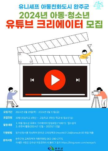 서금란 교육정책과장은 “완주군 아동친화도시 정책을 보다 알기 쉽게 전하기 위해 아동·청소년이 직접 기획·제작하는 유튜브 크리에이터 운영을 시작한다”며 “이번 사업을 통해 아동·청소년이 유튜브 크리에이터로서 다양한 진로활동을 탐색하고, 완주군의 아동·청소년 정책이 많은 군민들에게 홍보되기를 기대한다”고 밝혔다.