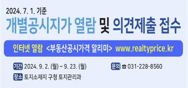 수원시 영통구는 2024년 7월 1일 기준 개별공시지가 조사 대상 64필지에 대해 9월 2일부터 9월 23일까지 21일간 지가 열람을 실시하고 토지 소유자 및 이해관계인의 의견을 접수한다.