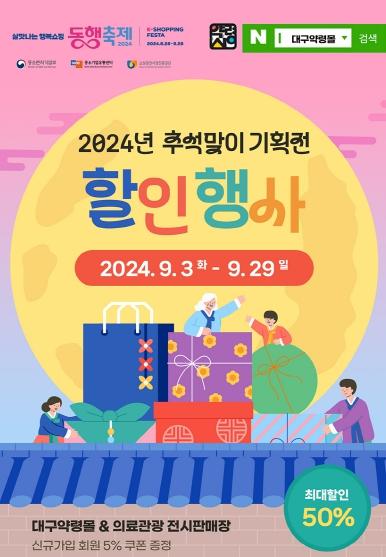대구광역시는 추석 명절을 맞아 개최되는 ‘2024년 9월 동행축제’ 기간 동안 의료관광 전시판매장(중구 남성로 25, 1층)과 대구 약령몰에서 할인행사를 진행한다.