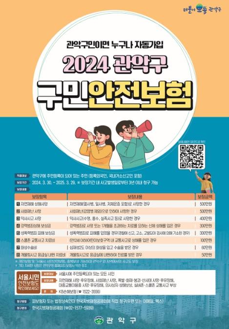 서울 관악구는 전 구민을 대상으로 ‘2024년 관악구 구민안전보험’ 을 가입하고 일상 속 예기치 못한 사고로 피해를 입은 구민에게 신속한 재정 지원으로 최소한의 생활 안정을 보장하고자 발벗고 나섰다.
