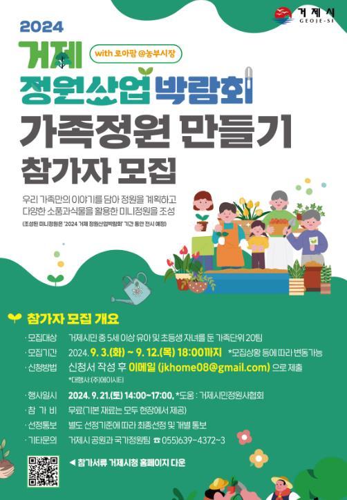 거제시는 ‘2024 거제 정원산업박람회’가 열리는 능포수변공원 일원에 가족정원을 조성하고 가꾸는 ‘가족정원 만들기’체험 행사 참가자를 모집한다.