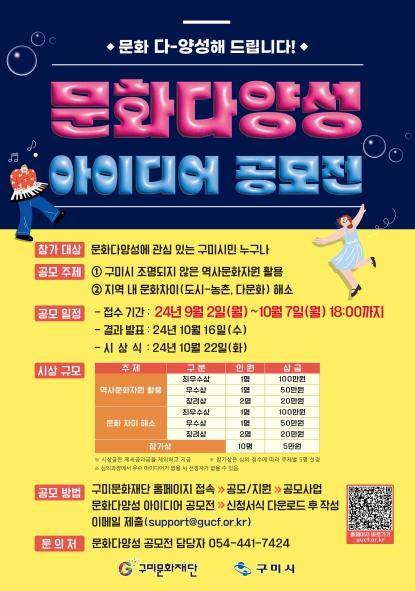 구미문화재단은 9월 2일부터 10월 7일까지 구미시민을 대상으로 '문화다양성 아이디어 공모전'을 개최한다.