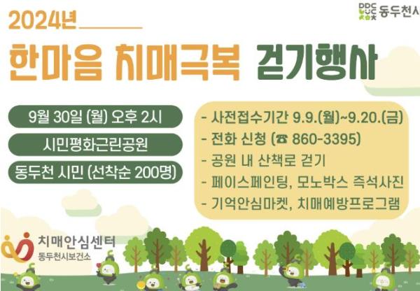 동두천시 치매안심센터는 제17회 치매극복의 날(9월 21일)을 기념해 오는 9월 30일 오후 2시 시민평화 근린공원에서 ‘한마음 치매극복 걷기행사’를 실시한다.