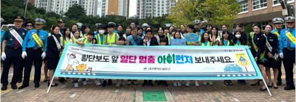 대구 달서구가 3일 아침 월암초등학교 학생 및 교사, 달서녹색어머니회, 달서경찰서와 함께 월암초등학교 앞 횡단보도에서‘아이먼저’어린이 교통 안전 캠페인을 실시했다.