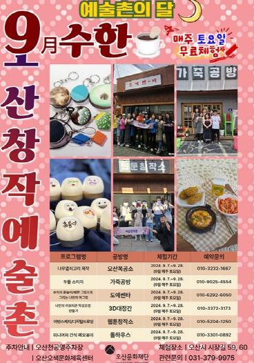 2024년 (재)오산문화재단에서는 2024 오산창작예술촌 신규 행사로‘예술촌의 달’을 기획하여, 예약을 통한 참여자를 모집한다.