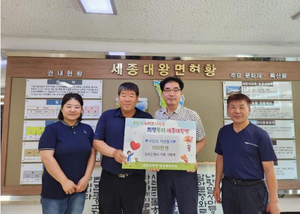 홍광래 세종대왕면장은 “어려운 이웃을 위해 희망과 사랑으로 나눔운동에 앞장서 주시는 마음 감사드린다.”며 “기탁해 주신 성금은 복지 지원이 필요한 위기가구를 위해 소중하게 사용하겠다.”고 전했다.