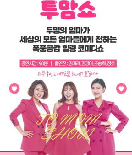 ‘투맘쇼’는 김미려, 김경아, 조승희 등 총 5명의 희극인이 가사노동으로 인한 스트레스를 해소하기 위해 만든 개그 토크쇼로, 유머와 공감으로 채운 진솔한 육아 이야기를 재치 있는 입담과 함께 관객들에게 전할 예정이다.