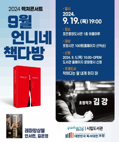 포항시는 오는 19일 저녁 7시 포은중앙도서관 어울마루에서 2024 렉쳐콘서트 ‘언니네 책다방’의 일곱 번째 시간, ‘착하다는 말 내게 하지 마’를 주제로 김강 작가 초청 강연을 진행한다.