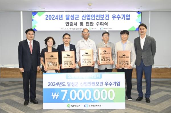 달성군은 올해 선정된 5개 사업장에 대해 산업안전보건 우수기업 인증서 및 현판을 수여하고, 근로시설 및 안전장비 개선에 활용할 수 있는 노동환경개선 사업비를 기업당 최대 7백만 원 지원한다.