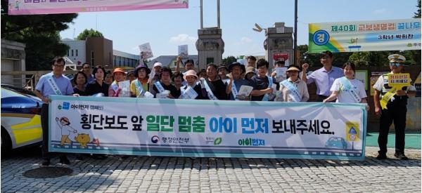 이날 캠페인에는 청주시, 청원경찰서, 자율방재단, 안전보안관 등 50여명이 참여했다. 참여자들은 ‘일단멈춤, ‘아이 먼저’보내주세요’ 등의 문구가 담긴 현수막, 리플릿 등을 활용해 교통안전 홍보 활동을 펼쳤다.