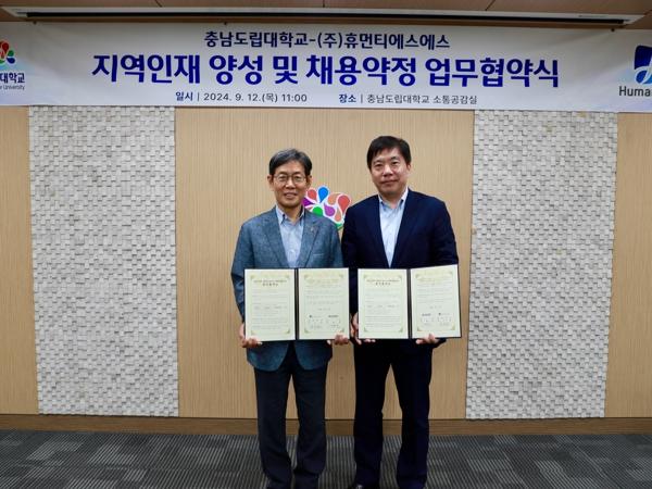 충남도립대학교와 ㈜휴먼티에스에스는 12일 지역인재 양성 및 채용약정에 관한 업무협약을 체결했다.