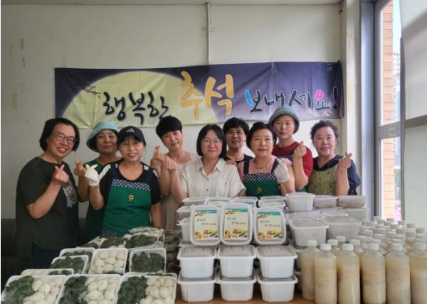 올해도 추석 맞이 음식 나눔 행사를 위해 새마을부녀회 회원 10여 명이 참여했다. 이날 정성껏 재료를 준비해 이웃을 위한 마음을 담아 송편, 식혜, 녹두전, 밑반찬 등을 직접 만들었다. 이후 취약계층 40가구에 전달했다.