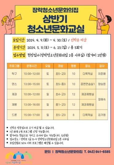 제천시 장락청소년문화의집은 4월 9일부터 상반기 청소년문화교실 참여자를 모집한다고 밝혔다.