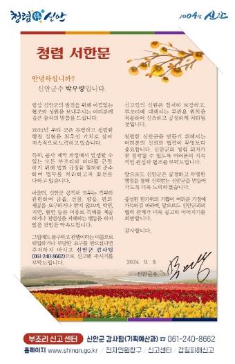 신안군은 지난 9일, 추석을 앞두고 1,000여 개의 공사ㆍ용역 계약업체에 청렴서한을 전달했다고 밝혔다.
