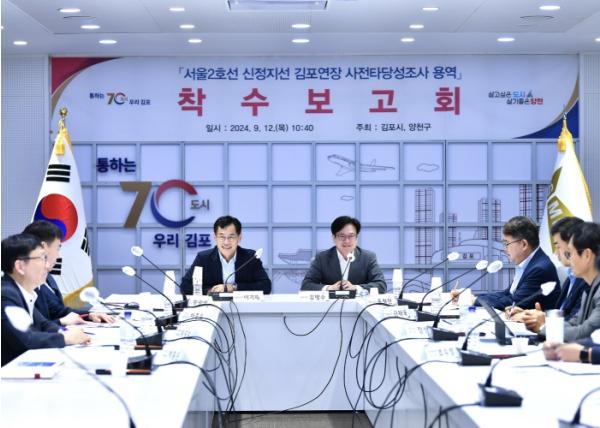 김포시는 지난 12일 양천구와 함께 '서울2호선 신정지선 김포연장'을 위한 사전타당성조사 용역 착수보고회를 개최했다고 밝혔다.