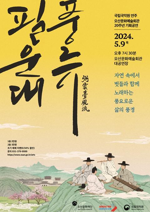 오산문화재단에서 2024 국립국악원에서 주최한 '국악을 국민속으로'라는 공모사업에 선정되어 조선시대 양반들의 봄놀이를 재현한 정통 국악 '필운대풍류'를 오는 5월 9일 목요일 저녁 7시 30분 문화예술회관 대공연장에서 선보일 예정이다.