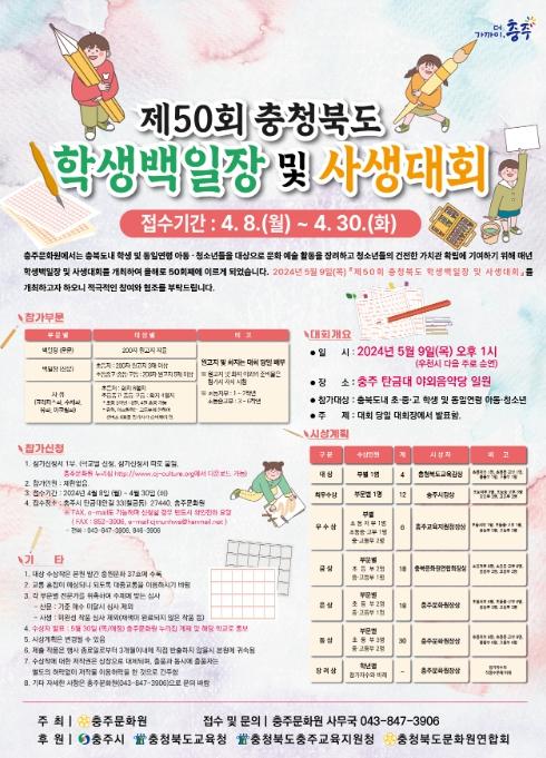 충주문화원는 ‘제50회 충청북도 학생백일장 및 사생대회’를 5월 9일 충주 탄금대 야외음악당 일원에서 개최한다고 밝혔다.