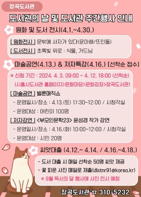 한편, 4월 도서관 주간을 맞아 장곡도서관에서는 다양한 행사가 개최된다. ▲4월 16일 화요일 오전 10시에는 도서 '부모 인문학23'을 집필한 윤성경 작가의 특강이 열리고 ▲4월 13일 토요일 오전 11시 30분에는 마술 공연인 ‘벌룬 매직쇼’가 진행된다.