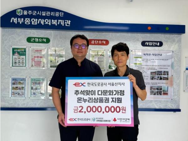 한국도로공사 서울산지사가 12일, 울주군시설관리공단 서부종합사회복지관을 방문해 추석을 맞이하는 다문화가정을 대상으로 사용해 달라며 온누리상품권 200만원을 전달했다.