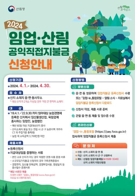 신청 대상은 ‘임업직불제법’에 따라 지급대상 산지에서 임산물생산업과 육림업에 종사하는 임업인과 농업법인이다.