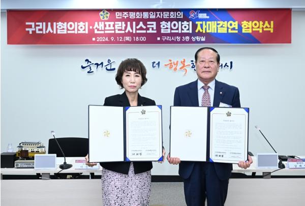 구리시는 9월 12일 구리시청 3층 상황실에서 백경현 구리시장을 비롯한 민주평통 자문위원 등 60명이 참석한 가운데 민주평화통일자문회의 구리시협의회와 샌프란시스코협의회가 자매결연식을 가졌다고 전했다.