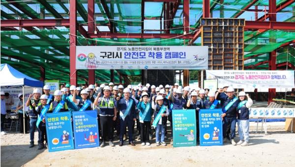 이번 합동 캠페인은 산업재해를 예방하고 안전한 근무 환경을 조성하기 위해 구리시와 경기북부노동인권센터가 주관하고 경기 북동부권역 7개 시군과 구리농협, 한국직장건강간호협회 등 관계자 70여 명이 참석한 가운데 건설 현장의 가장 기초가 되는 안전모 착용을 주제로 진행됐다.