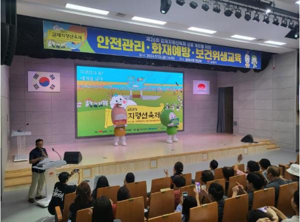이번 교육은 강기수 관광홍보축제실장의 축제 개요 설명에 이어 김제소방서의 화재 예방 교육, 한국 가스안전공사 전북지역본부의 가스안전관리 교육, 김제시 보건위생과의 보건위생 교육, 마지막으로 경제진흥과의 김제사랑상품권 사용 교육 순으로 진행됐다.