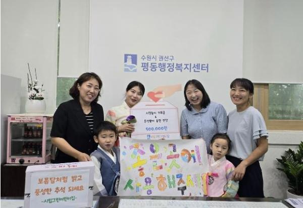 수원시 권선구 평동 시립그린어린이집은 지난 13일 ‘아나바다 시장놀이’ 활동으로 원아들이 모은 수익금 50만 원을 평동 행정복지센터에 기탁했다.