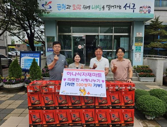 인천 서구 원당동 행정복지센터는 하나식자재마트(대표 조일환)로부터 지난 13일 관내 어려운 이웃을 위한 라면 100상자를 기탁받았다고 전했다.
