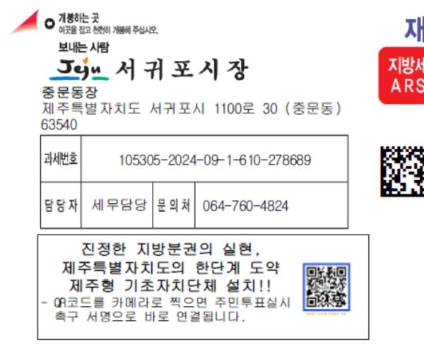 서귀포시에 따르면 최근 발행한 정기분 재산세 고지서 15만건과 9월분 상하수도 사용료 고지서 6만5천여건의 여백에 제주형 기초자치단체 설치 안내 영상과 주민투표 실시 촉구 대정부 서명 링크 연결 QR코드를 삽입해 제주형 기초자치단체 설치에 대한 대시민 홍보에 적극 나서고 있다.