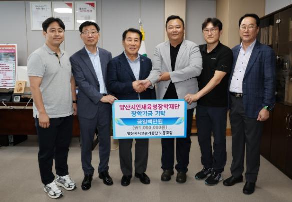 양산시시설관리공단노동조합은 지난 13일 양산시장 집무실을 방문해 양산시인재육성장학재단에 장학기금 100만원을 기탁했다.