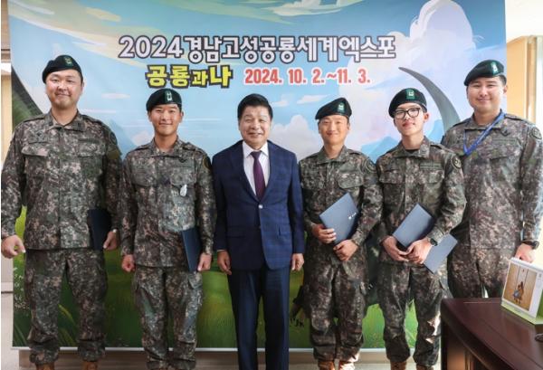 고성군은 지난 10일 군수실에서 2024년 을지연습에서 모범적으로 활약한 제8358부대 2대대 유공자 4명에게 군수 표창을 수여하고 그간의 노고를 격려했다.